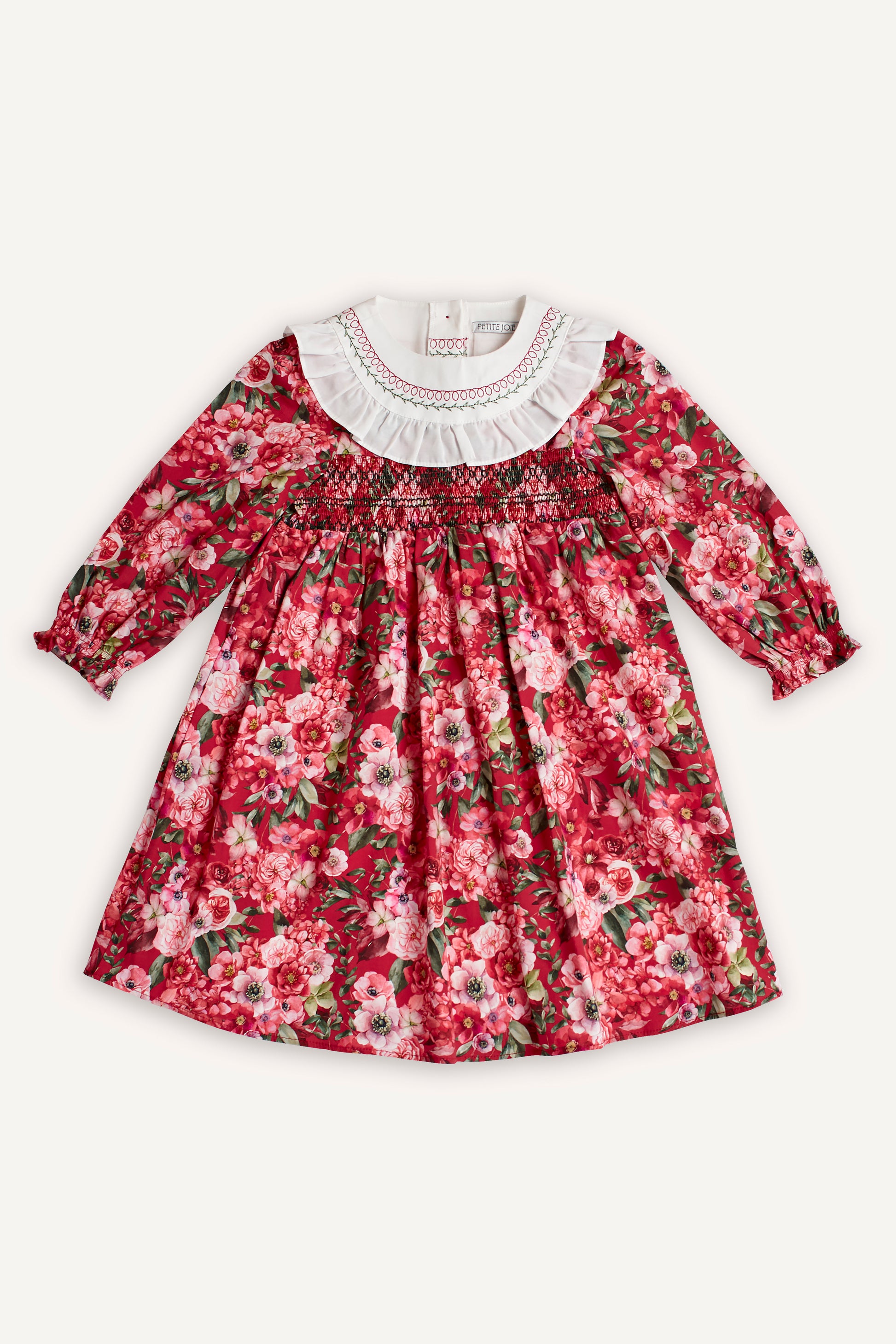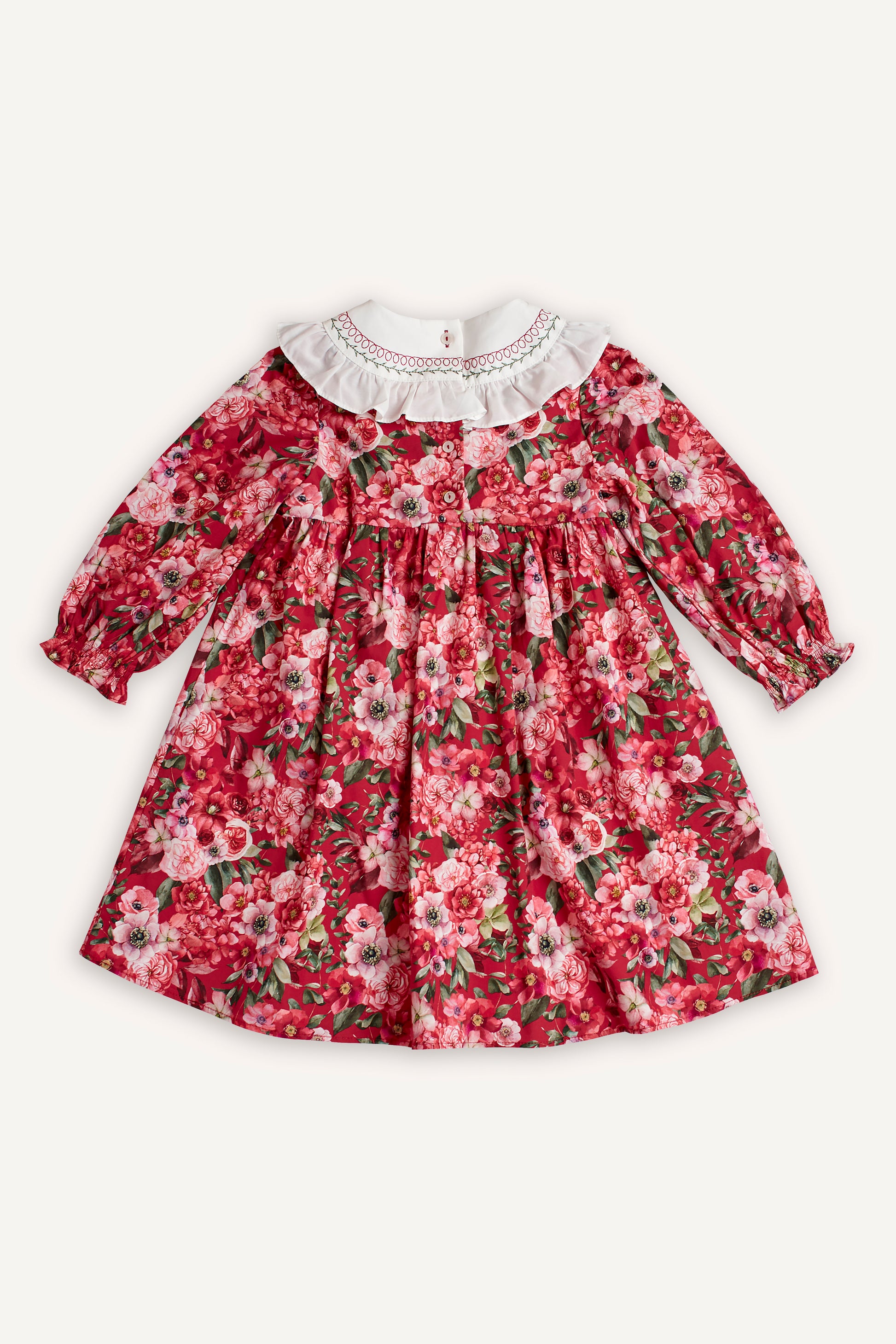 Fırfır ve nakışlı yaka detaylı uzun kollu elbise